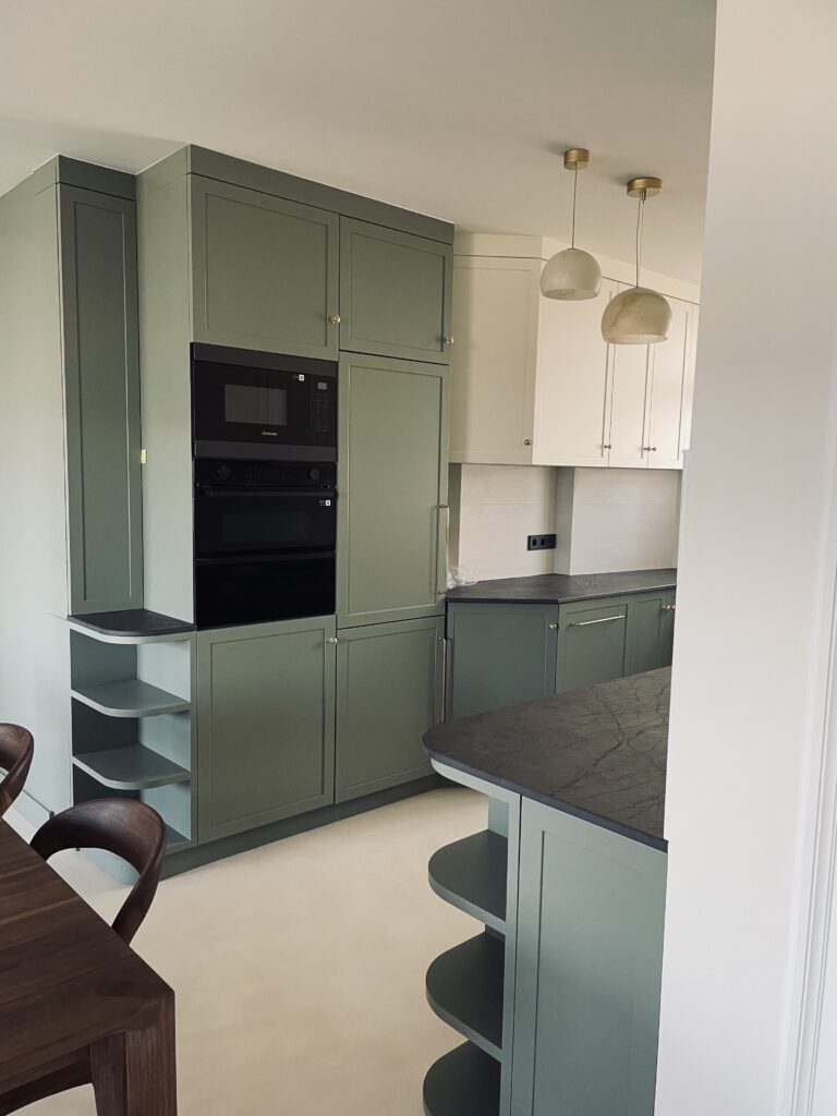 Il s’agit – lors de cette commande- de rénover un appartement de style Art déco situé en hyper centre d’Annecy. Les clients souhaitent ouvrir au maximum l’espace afin de redonner plus d’ampleur et de luminosité au lieu. Un mur porteur central sera tout d’abord supprimé pour faciliter la rénovation. Cela permettra notamment de connecter la cuisine avec les pièces de vie. La disposition et usage des pièces sera ensuite repensée. Une deuxième salle de bain sera crée afin de répondre aux besoins du logement présentant 3 chambres. Le projet mêle ancien et contemporain de façon sensible. Les moulures et corniches d’origine (1926) seront conservées voir mise en avant. Celles-ci seront confrontées à des mobiliers plus modernes mais faisant écho via les formes ou détails.