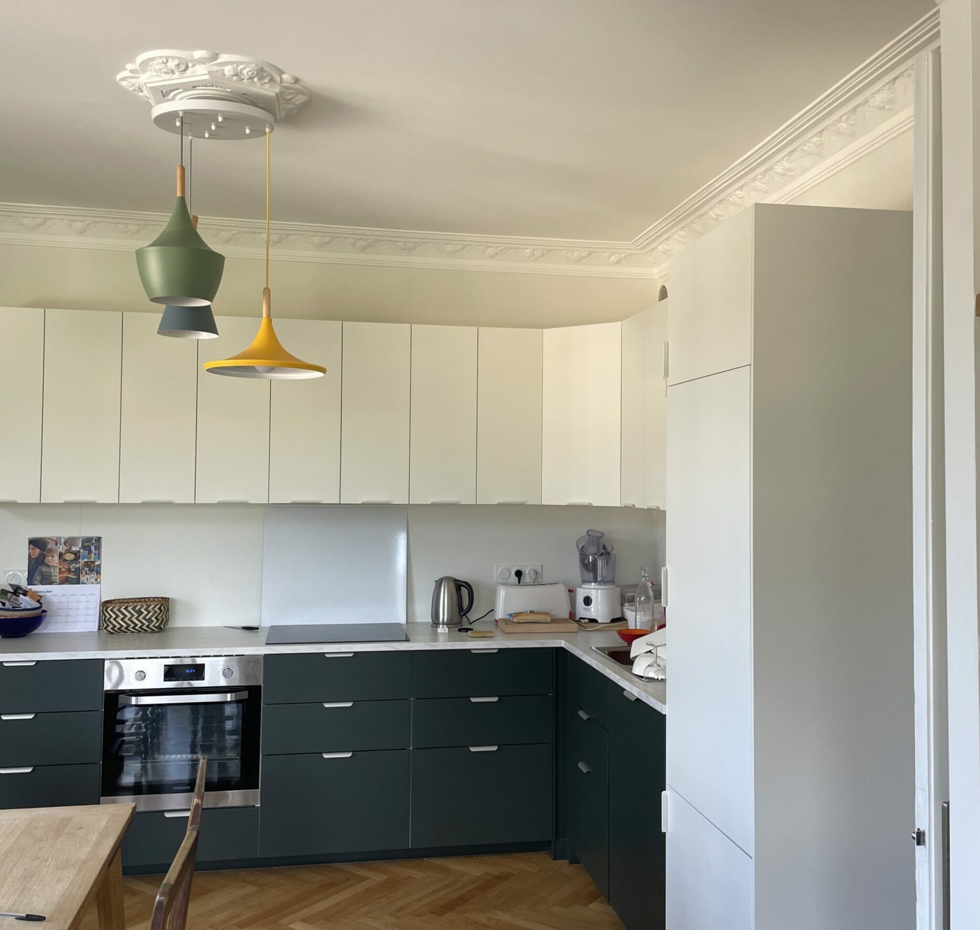 Il s’agit – lors de cette commande- de rénover un appartement de type R+7 + combles de style Art déco, situé en hyper centre d’Annecy . Les clients souhaitent repenser la disposition des pièces afin de pouvoir accueillir aisément leurs 4 enfants. Un couloir est crée pour relier 2 nouvelles chambres. Une trémie + escalier compact sont imaginés pour exploiter au mieux les combles. La cuisine est déplacée à proximité du séjour afin de pouvoir répondre aux usages actuels (cuisine ouverte). Les moulures de l’époque 1930 sont conservées et revalorisées pour conserver le cachet du lieu. Les parquets sont repris tout en travaillant sur des motifs d’inspiration Art déco.
